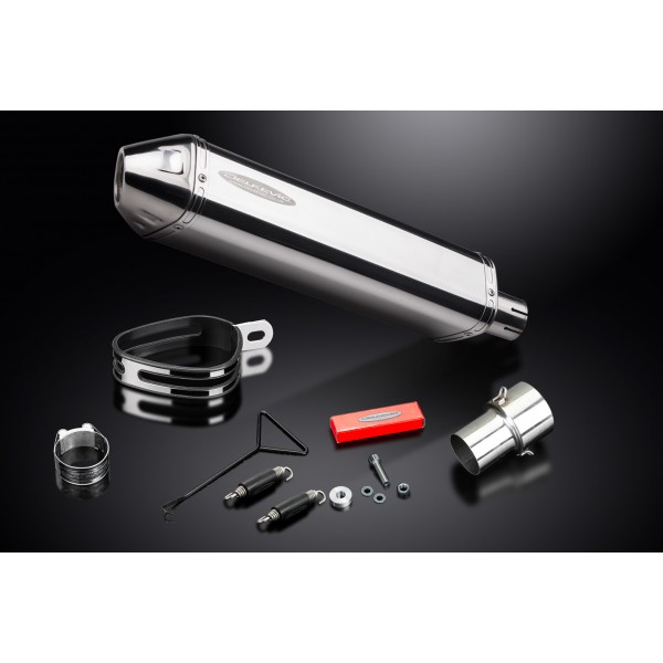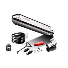 • This set includes - Delkevic silencer with removable baffle, link pipe, strap, clamp, washers, nyloc nut, cap screw, spacer, and spring hooks.