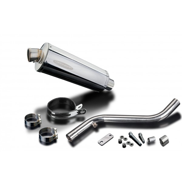 • This set includes - Delkevic silencer with a removable baffle, link pipe, strap, clamps, hex head bolt, cap screw, washers, lock nuts, and offset drop bracket.