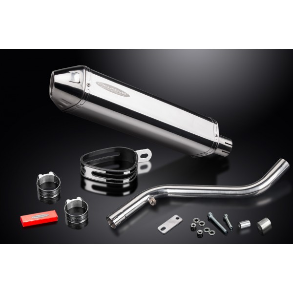 • This set includes - Delkevic silencer with a removable baffle, link pipe, strap, clamps, hex head bolt, cap screw, washers, lock nuts, and offset drop bracket.