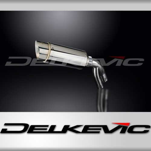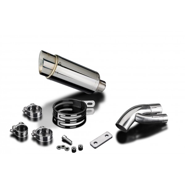 • This set includes - Delkevic silencer with a removable baffle, link pipe, strap, clamps, nyloc nuts, cap screws, washers, and bracket.