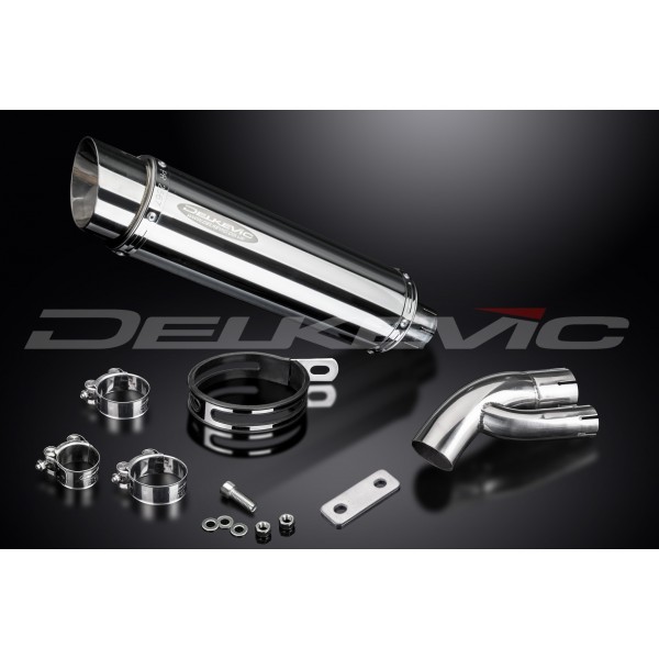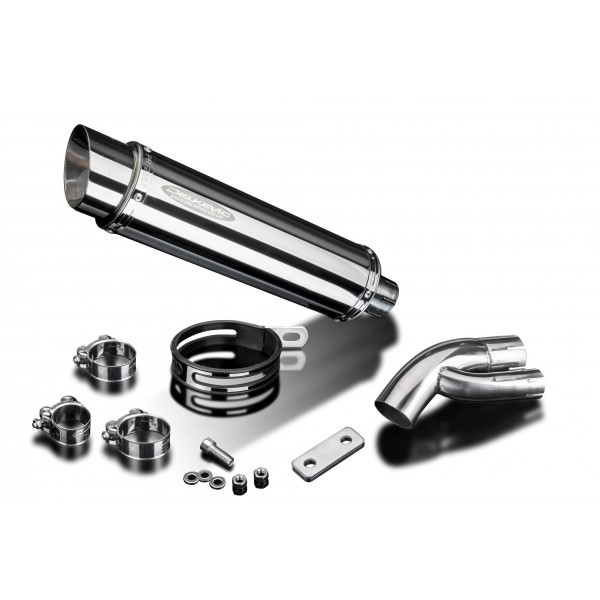 • This set includes - Delkevic silencer with a removable baffle, link pipe, strap, clamps, nyloc nuts, cap screws, washers, and bracket.
