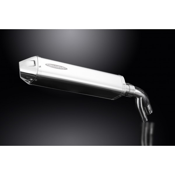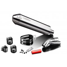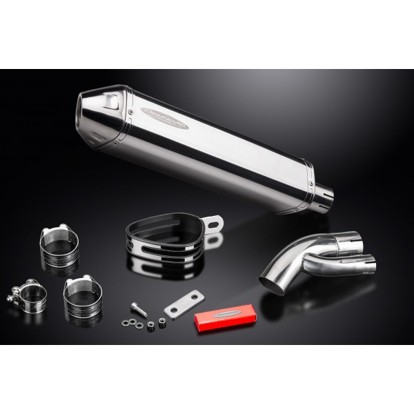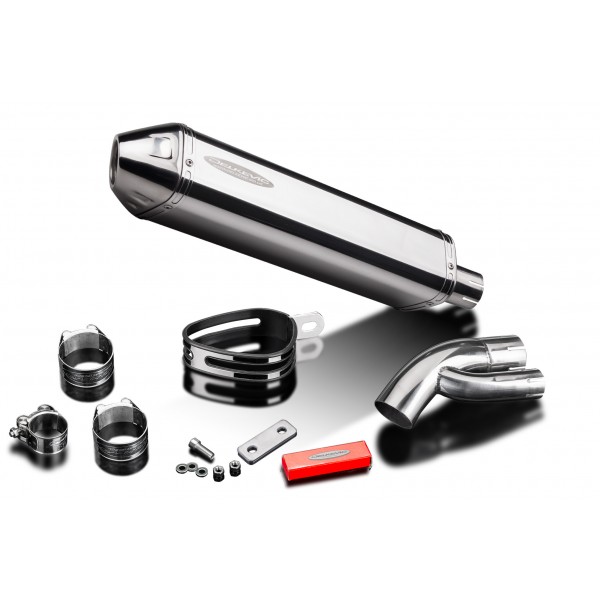 • This set includes - Delkevic silencer with a removable baffle, link pipe, strap, clamps, nyloc nuts, cap screws, washers, and bracket.