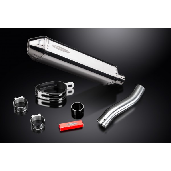 • This set includes - Delkevic silencer with a removable baffle, link pipe, strap, and clamps.