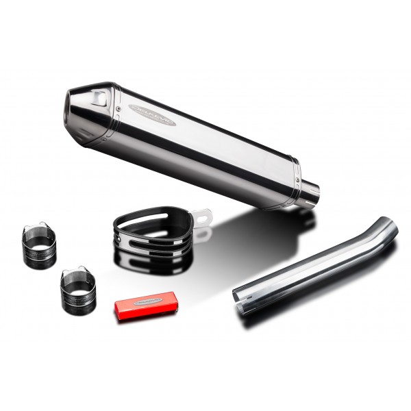 • This set includes - Delkevic silencer with a removable baffle, link pipe, clamps, and strap.