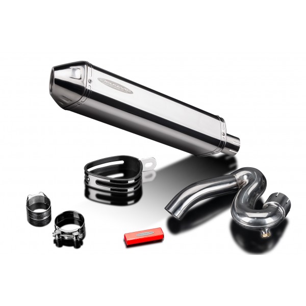 • This set includes - Delkevic silencer with a removable baffle, link pipe, strap, and clamps.