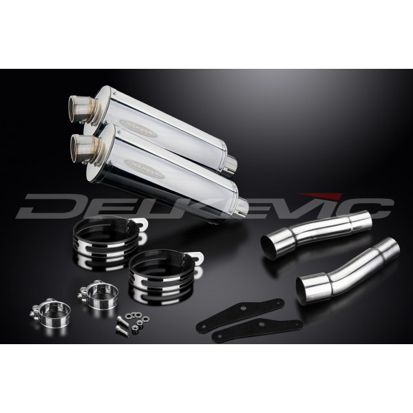 • This set includes - Delkevic silencers with removable baffles, link pipes, silencer straps, brackets, clamps, and fixings.