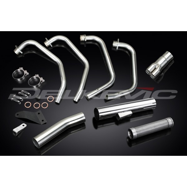 • This set includes - Delkevic down pipes, Classic style silencer with a removable baffle, link pipe, gaskets, bracket, stand stop rubber, spring hooks, and clamps.