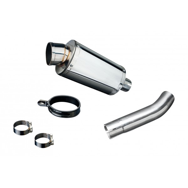 • This set includes - Delkevic silencer with a removable baffle, link pipe, clamps, and strap.