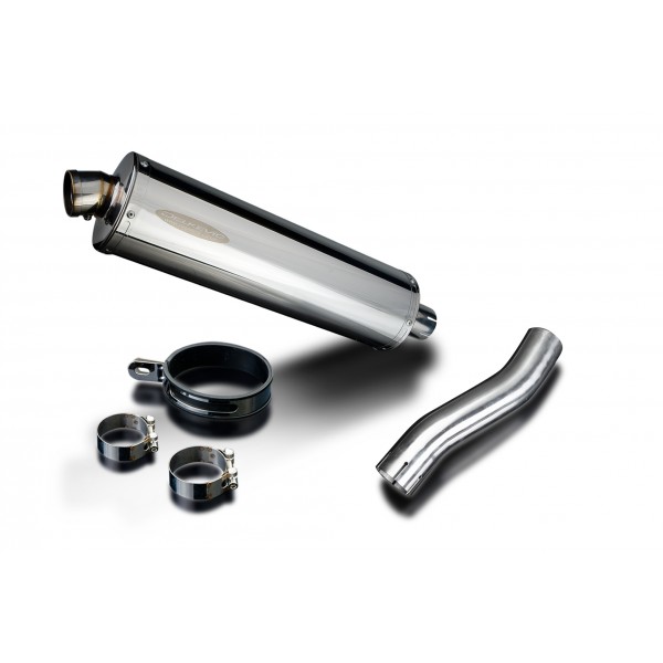 • This set includes - Delkevic silencer with a removable baffle, link pipe, strap, and clamps.