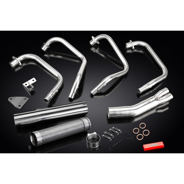 • This set includes - Stainless Delkevic downpipes, classic style stainless straight silencer, and bracket..