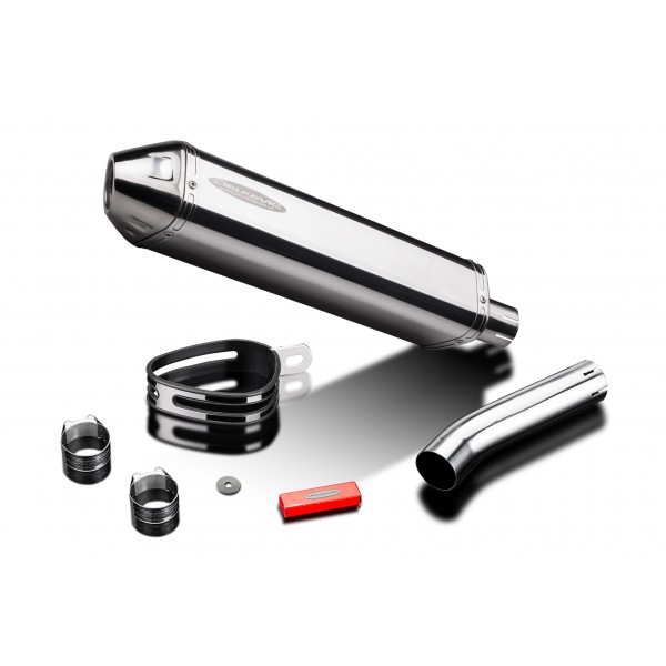 • This set includes - Delkevic silencer with a removable baffle, linkpipe, clamps, and strap.