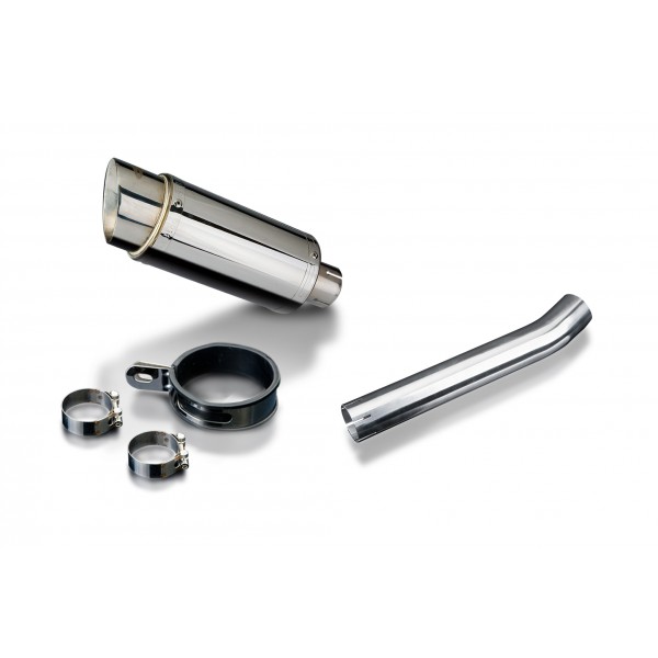 • This set includes - Delkevic silencer with a removable baffle, link pipe, clamps, and strap.