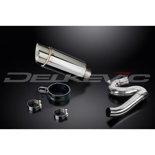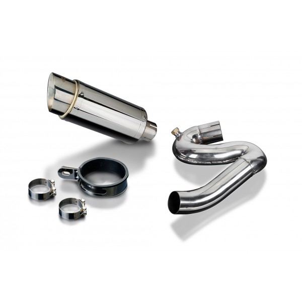 • This set includes - Delkevic silencer with a removable baffle, link pipe, clamps, and strap.
