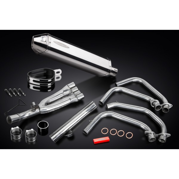 • This set includes - Delkevic down pipes, link pipe, silencer with a removable baffle, strap, clamps, and gaskets.