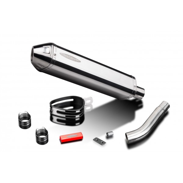 • This set includes - Delkevic silencer with a removable baffle, link pipe, clamps, and strap.