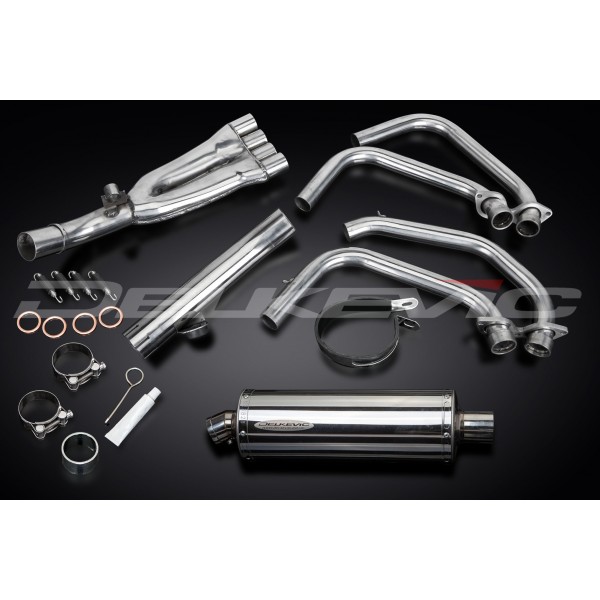 • This set includes - Delkevic down pipes, link pipe, silencer with a removable baffle, strap, clamps, and gaskets.