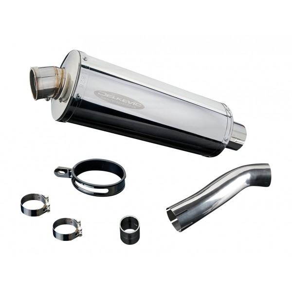 • This set includes - Delkevic silencer with a removable baffle, link pipe, strap, clamps, and additional bracket.