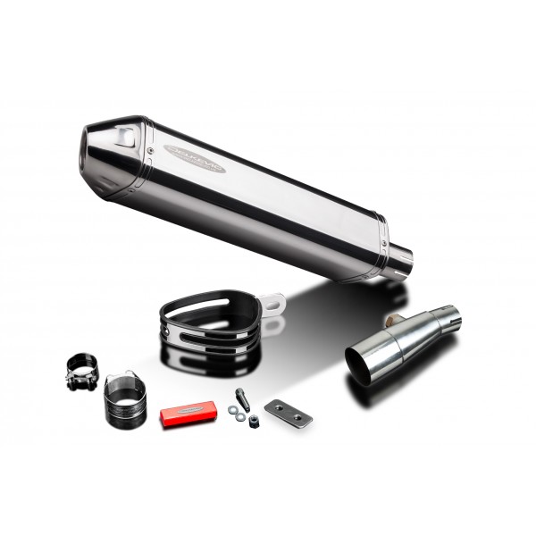 • This set includes - Delkevic silencer with a removable baffle, link pipe, strap, and clamps.