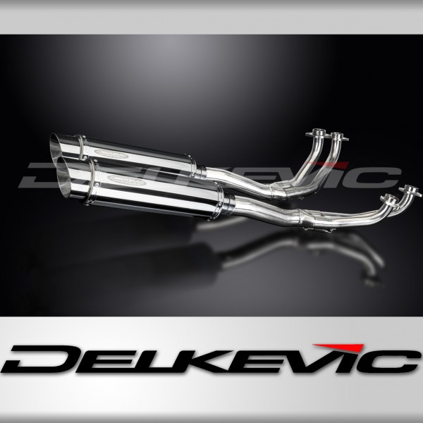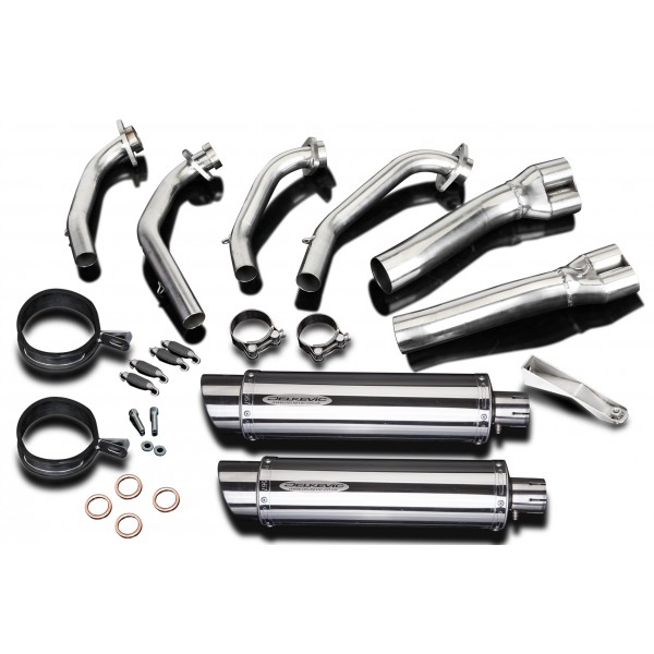 • This set includes - Delkevic down pipes, silencers with a removable baffle, bracket, straps, clamps, gaskets, washers, cap screws, and spring hooks.