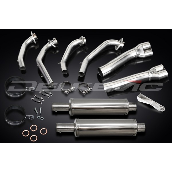 • This set includes - Delkevic down pipes, silencers with a removable baffle, bracket, straps, clamps, gaskets, washers, cap screws, and spring hooks.