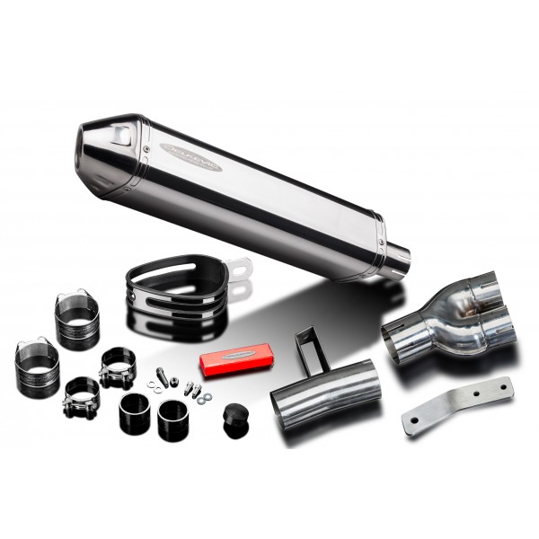 • This set includes - Delkevic silencer with a removable baffle, link pipe, strap, and clamps.