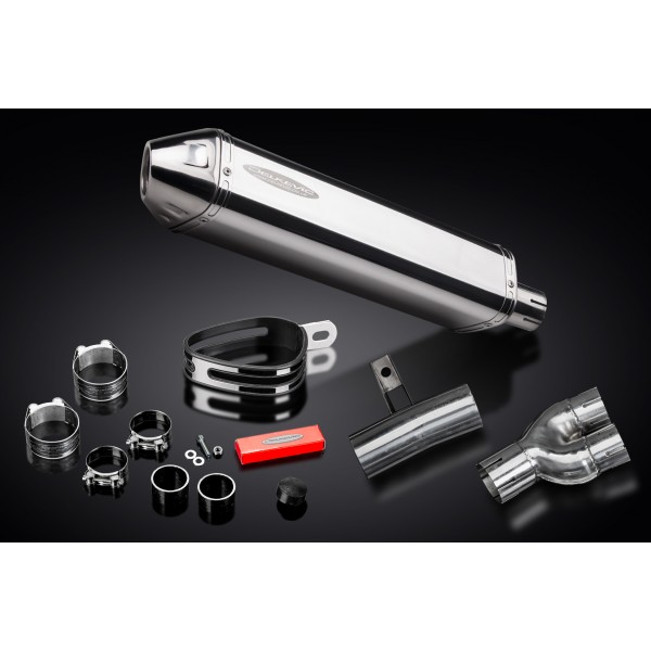 • This set includes - Delkevic silencer with a removable baffle, link pipe, strap, and clamps.