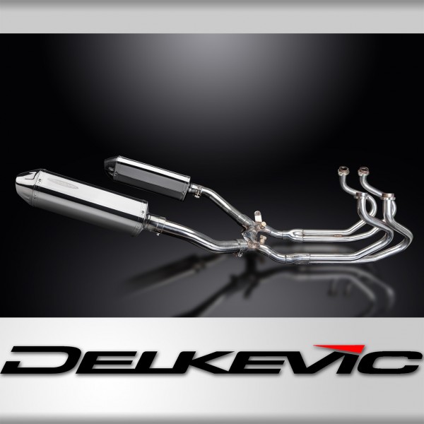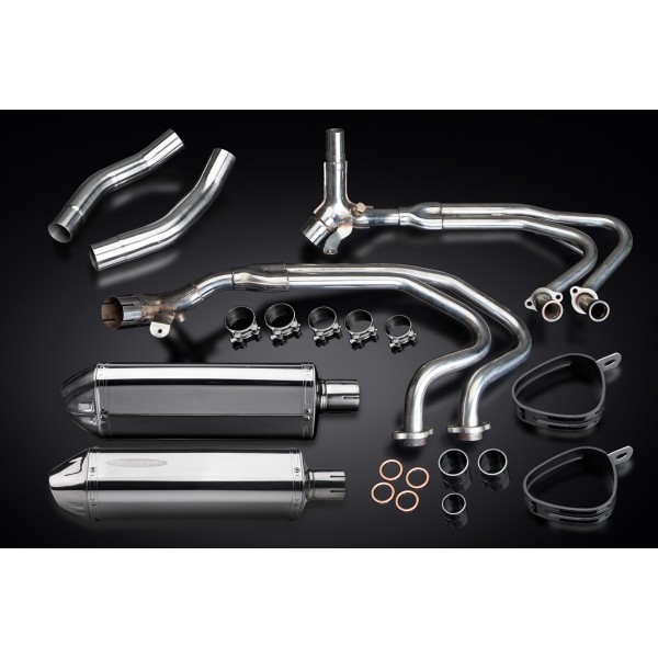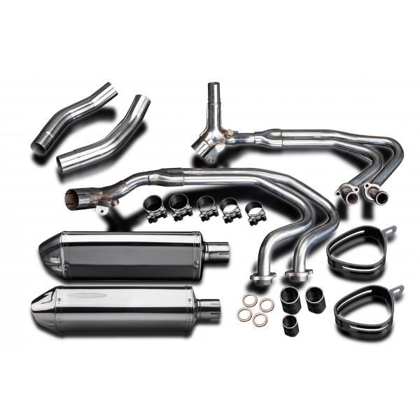 • This set includes - Delkevic down pipes, link pipes, silencers with removable baffles, straps, clamps, and gaskets.
