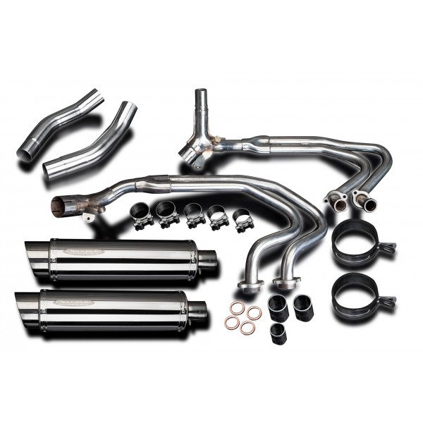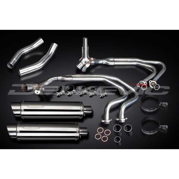 • This set includes - Delkevic down pipes, link pipes, silencers with removable baffles, straps, clamps, and gaskets.