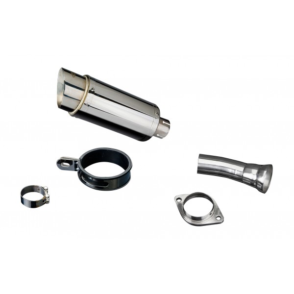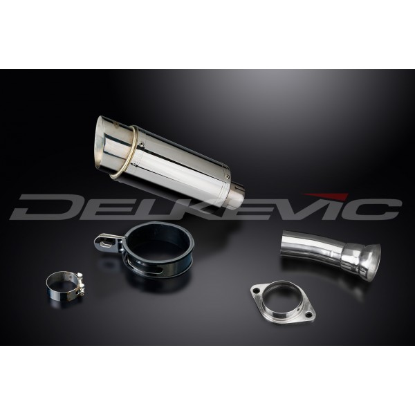 • This set includes - Delkevic silencer with a removable baffle, Linkpipe, clamp, flange, and strap.