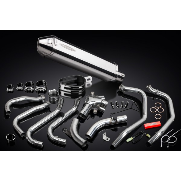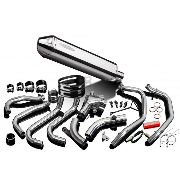 • This set includes - Delkevic down pipes, link pipe, silencer with a removable baffle, strap, clamps, gaskets, stand stop rubber, spring hooks, bracket, and wiring kit.