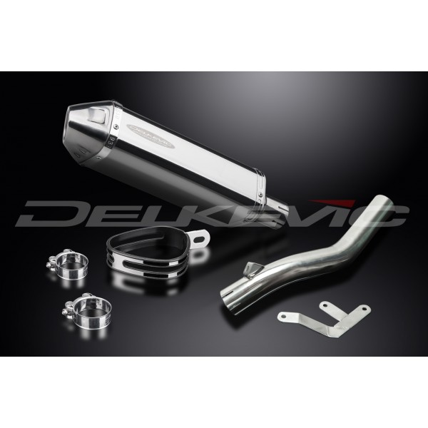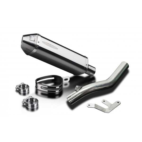• This set includes - Delkevic silencer with a removable baffle, link pipe, strap, clamps, and additional bracket.
