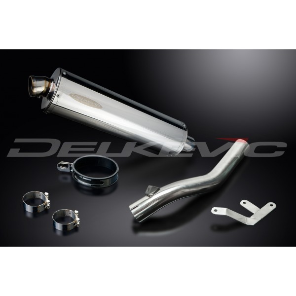 • This set includes - Delkevic silencer with a removable baffle, link pipe, strap, clamps, and additional bracket.