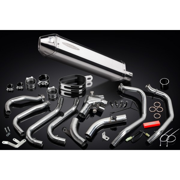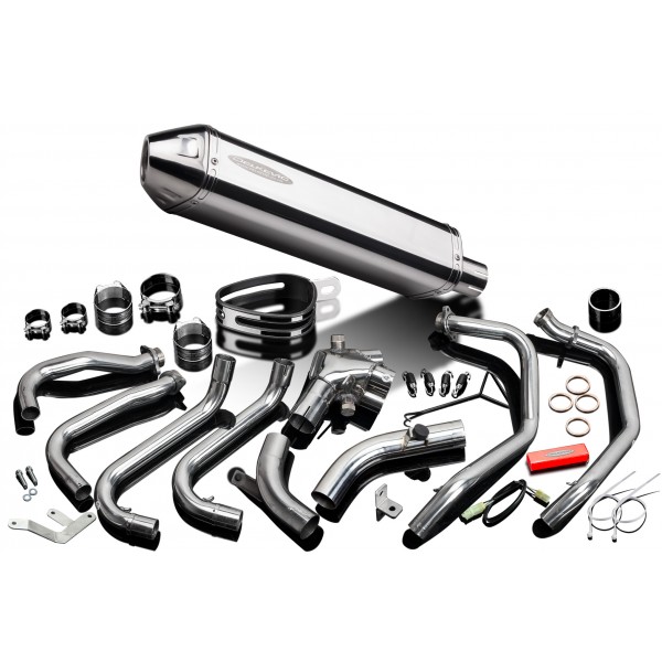 • This set includes - Delkevic down pipes, link pipe, silencer with a removable baffle, strap, clamps, gaskets, stand stop rubber, spring hooks, bracket, and wiring kit.