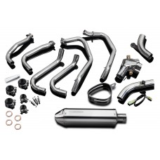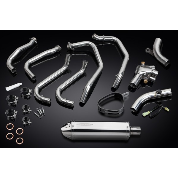 • This set includes - Delkevic down pipes, link pipe, silencer with a removable baffle, strap, clamps, gaskets, stand stop rubber, spring hooks, bracket, and wiring kit.