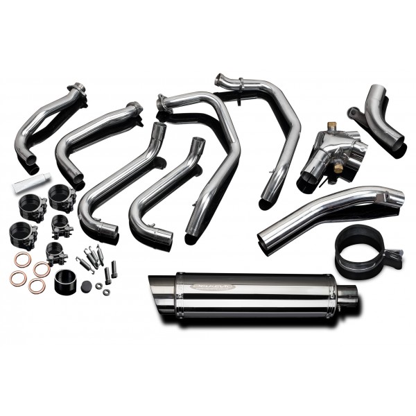 • This set includes - Delkevic down pipes, link pipe, silencer with a removable baffle, strap, clamps, gaskets, stand stop rubber, spring hooks, bracket, and wiring kit.