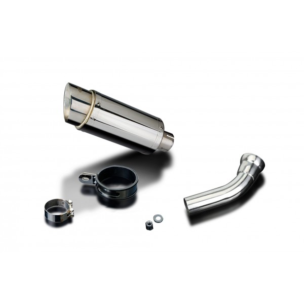 • This set includes - Delkevic silencer with a removable baffle, link pipe, silencer strap, clamp, nyloc nut, and washer.