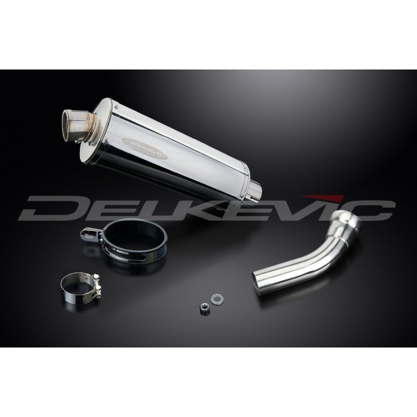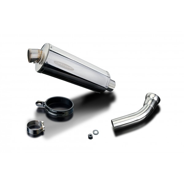 • This set includes - Delkevic silencer with a removable baffle, link pipe, silencer strap, clamp, nyloc nut, and washer.