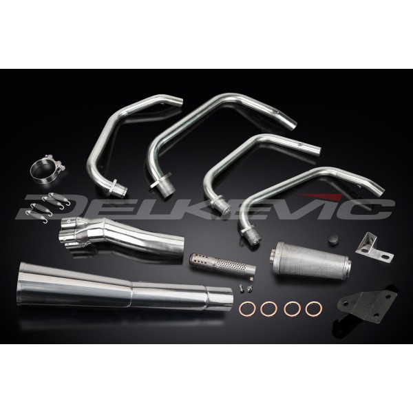 • This set includes - Delkevic down pipes, Classic style silencer with a removable baffle, clamp, gaskets, brackets, stand stop rubber, spring hooks, nyloc nuts, washers, and cap screws.