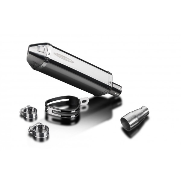 • This set includes - Delkevic silencer with a removable baffle, link pipe, clamps, and strap.