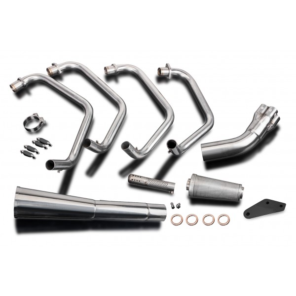 - This set includes - Delkevic down pipes, Classic style silencer with a removable baffle, clamp, gaskets, bracket, spring hooks, nyloc nuts, washers, and cap screws.