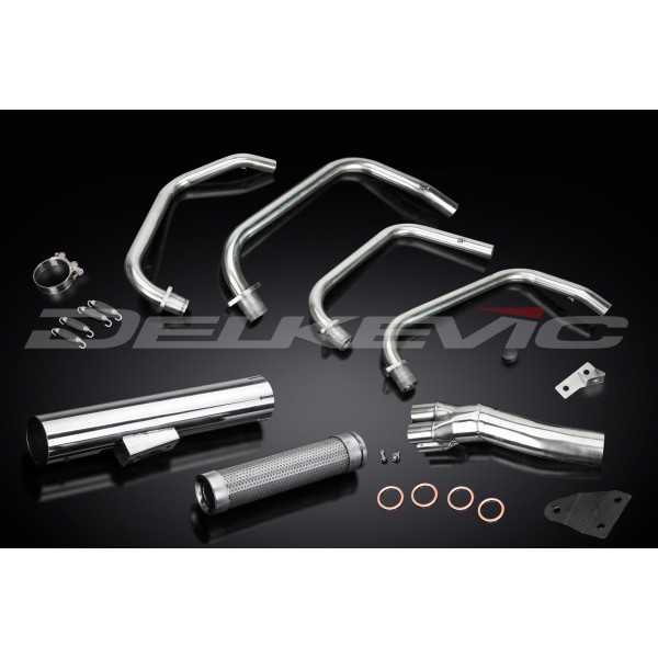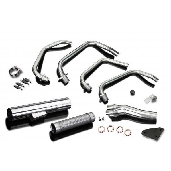 • This set includes - Delkevic down pipes, Classic style silencer with a removable baffle, clamp, gaskets, brackets, stand stop rubber, spring hooks, nyloc nuts, washers, and cap screws.