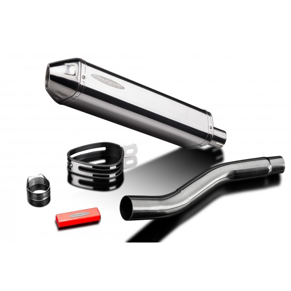 • This set includes - Delkevic silencer with a removable baffle, link pipe, strap, and clamp.