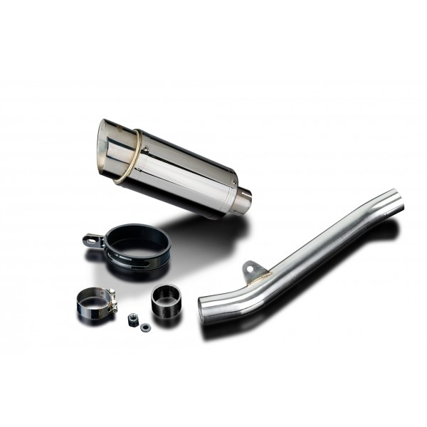 • This set includes - Delkevic silencer with a removable baffle, de-cat link pipe, strap, nyloc nut, washer, gasket, and clamps.
