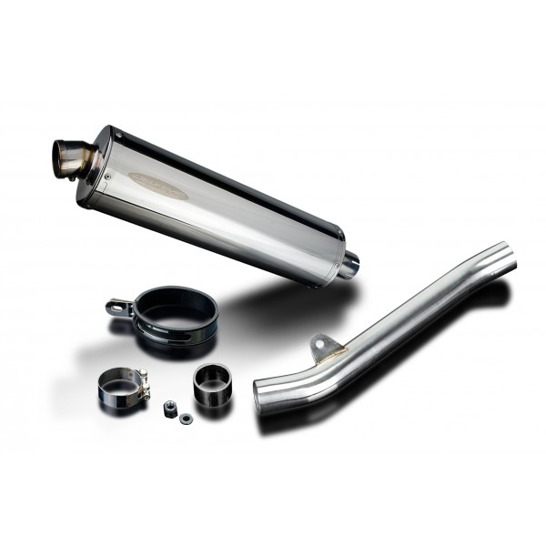 • This set includes - Delkevic silencer with a removable baffle, de-cat link pipe, strap, nyloc nut, washer, gasket, and clamps.