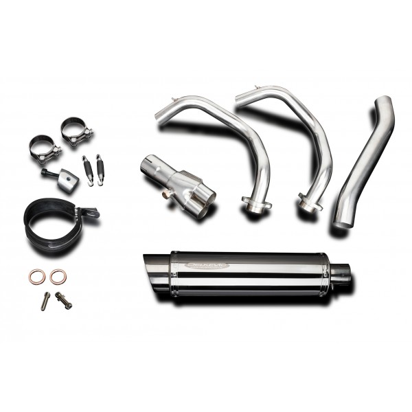 • This set includes - Delkevic down pipes, collector box, link pipe, silencer with removable baffles, strap, clamps, gaskets, nyloc nuts, cap screws, washers, spring hooks, and bracket.