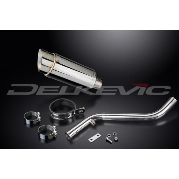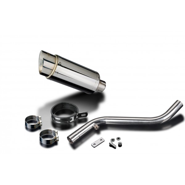 - This set includes - Delkevic silencer with a removable baffle, link pipe, strap, clamps, hex head bolt, cap screw, washers, lock nuts, and offset drop bracket.