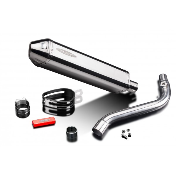 • This set includes - Delkevic silencer with a removable baffle, link pipe, strap, clamps, gasket, washers, spacers, cap screws, and nyloc nut.