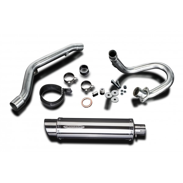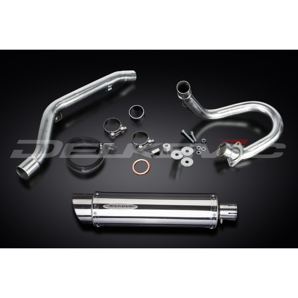 • This set includes - Delkevic down pipe, link pipe, Delkevic silencer with a removable baffle, strap, clamps, spacers, cap screws, nyloc nut, and gaskets.