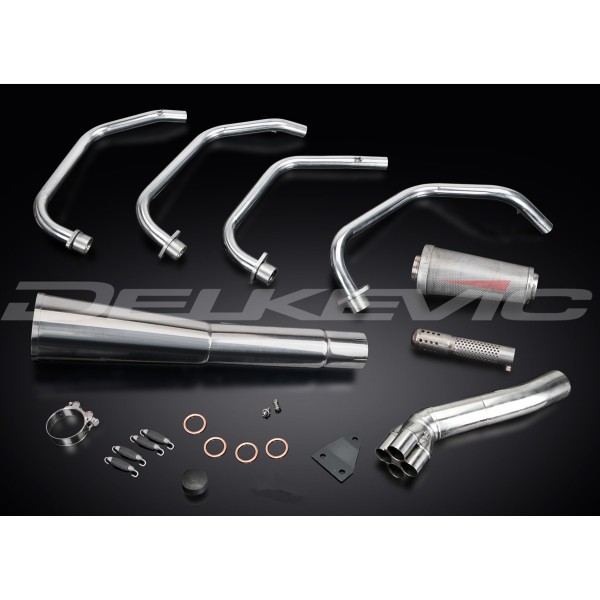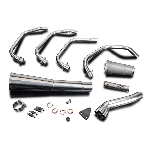 • This set includes - Delkevic down pipes, Classic style silencer with a removable baffle, clamp, gaskets, bracket, stand stop, stand stop rubber, spring hooks, nyloc nuts, washers, and cap screws.