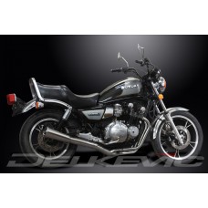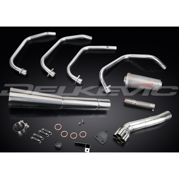 • This set includes - Delkevic down pipes, Classic style silencer with a removable baffle, clamp, gaskets, bracket, stand stop, stand stop rubber, spring hooks, nyloc nuts, washers, and cap screws.